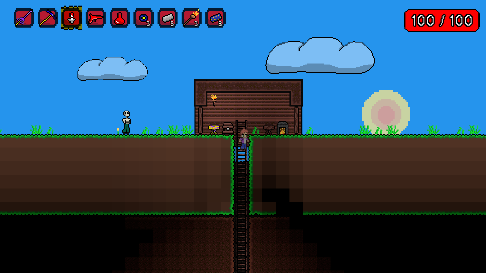 Mining: Delve into deep caves for rare materials. Crafting: Use Workbenches and Furnaces to upgrade your arsenal. Combat: Use swords, guns, throwing knives and other weapons to take down enemies and massive bosses. Survival: Manage your inventory, equip armor, and find shelter before the night comes.